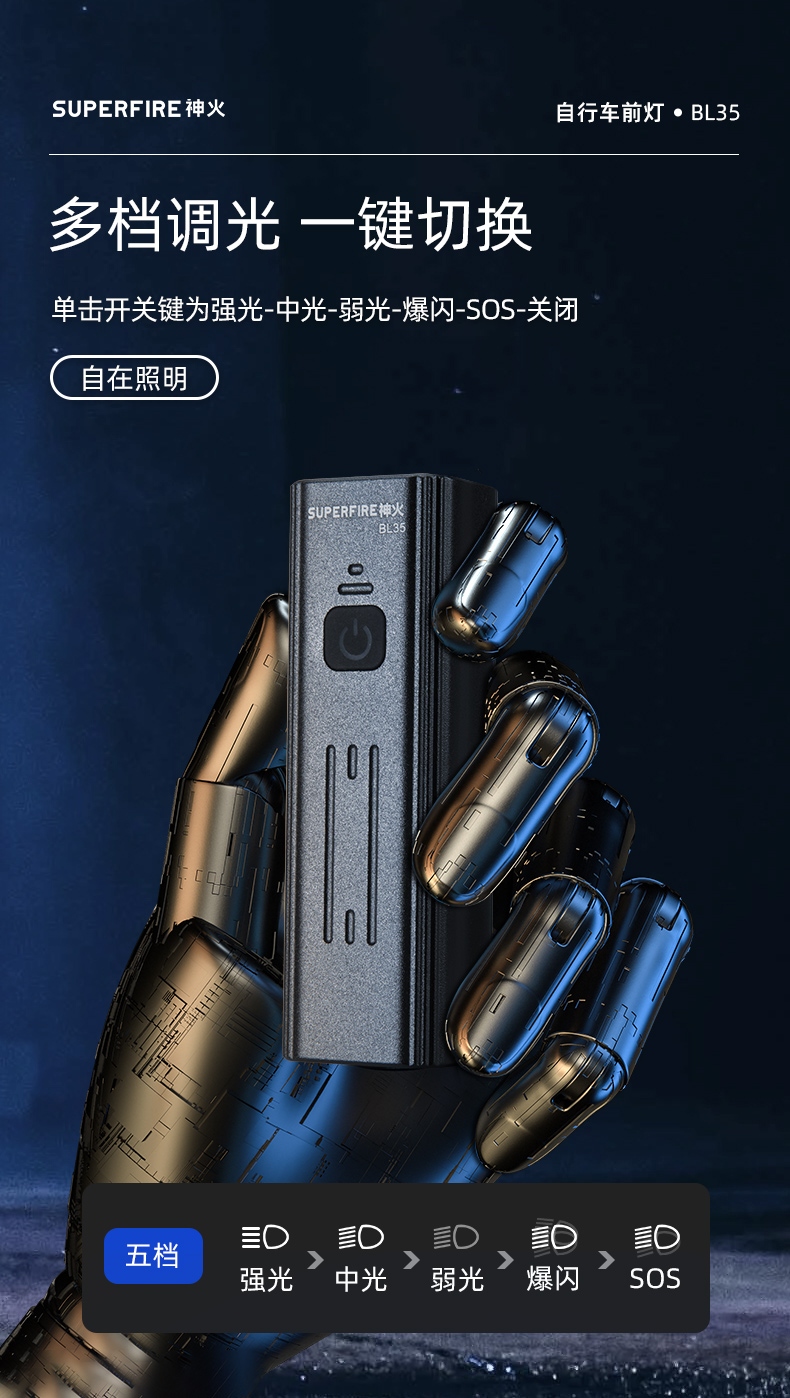 單擊開關鍵為強光-中光-弱光-SOS-關閉