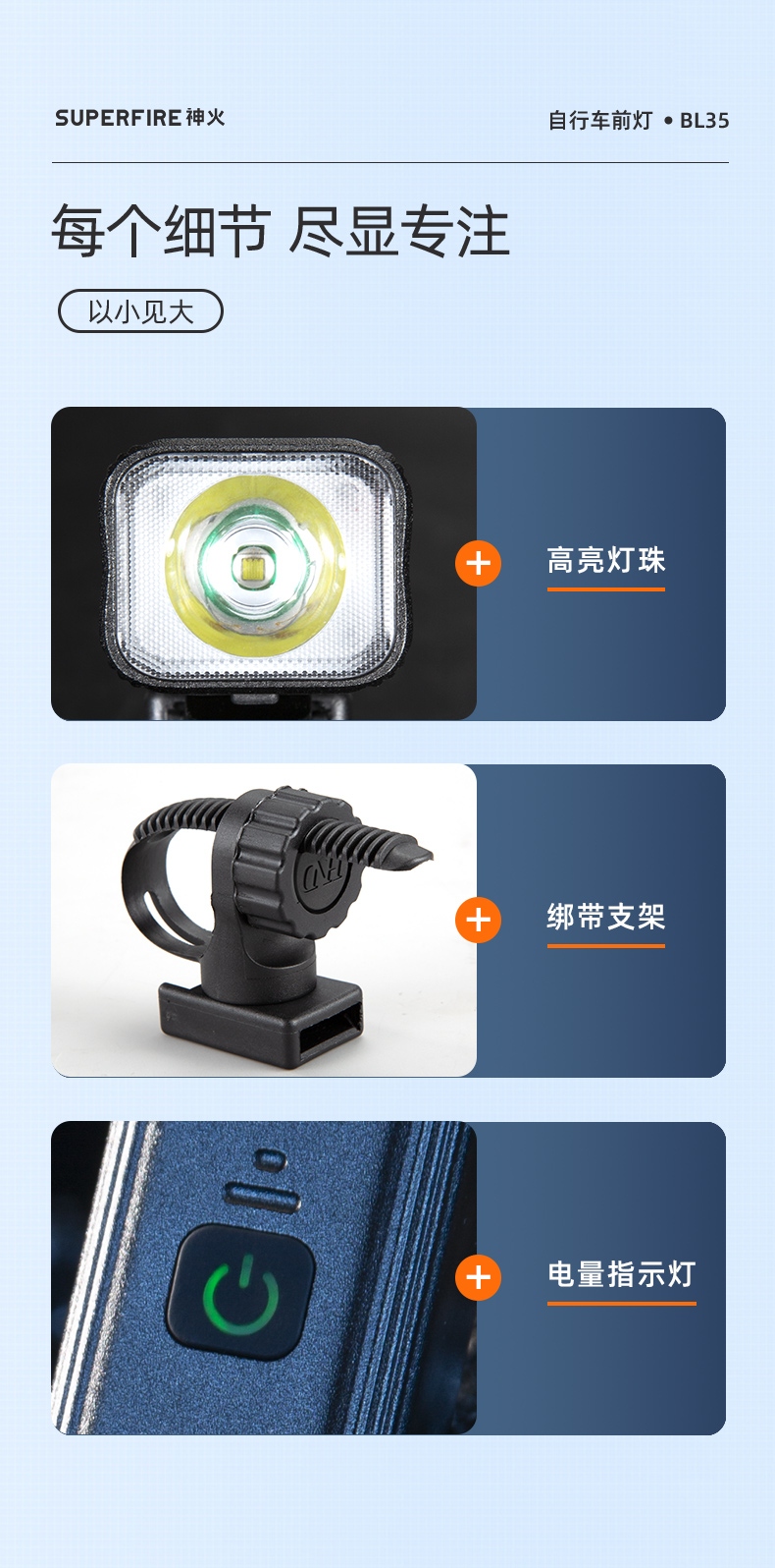 六大優勢 電量黑夜 多檔調光 充電指示 綁帶車夾 生活防水 鋁合金機身